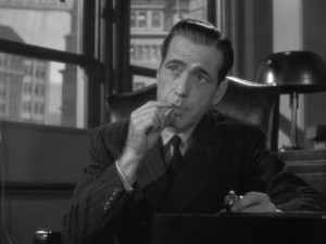 In Maltese Falcon, Bogart plays Detective Sam Spade, who’s trying to discover why a group of high-living lowlifes are trying to get their hands on a jewel-encrusted falcon.
