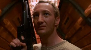 Hey, that sounds like A Nightmare on Elm Street. Wait, who is that young astronaut running down that spaceship corridor? Is that . . . why it IS! Robert Englund himself, looking all earnest until he has to fight an invincible, laughing double of himself, and then he’s not laughing any more. Englund is generous in the bonus material in an interview where he describes smoking a doobie in the lumber yard where Corman hid his studio. Englund also talks about how the spaceship corridor was given a futuristic look with painted styrofoam Whopper boxes. (Happily, the remark is illustrated with a clip.)