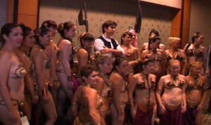 Available briefly on DVD back in 2010, Jedi Junkies returns outfitted with a bunch of extras, including a commentary track by director Mark Edlitz and his producing partners and a handful of deleted and extended scenes. Among them are a longer piece about the cult surrounding Princess Leia’s enslavement by Jabba the Hutt in Return of the Jedi. That the image of actress Carrie Fisher’s “Slave Leia” clad in her iconic metallic bikini has become fantasy fodder for boys and men for the past three decades isn’t all that surprising, I guess. And that Star Wars conventions are attended by dozens of women clad as Slave Leias who dance their way across the exhibition hall and pose for pics with anxious isn’t hard to believe either….