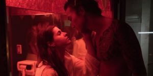 By day, Lost Girls & Love Hotels‘ Margaret (Alexandra Daddario, HBO’s True Detective) is a young professional American woman living in Japan and instructing aspiring flight attendants in the correct pronunciation of proper English. By night, she drinks copious amounts of alcohol with her friends Ines (Carice van Houten, Game of Thrones) and Liam (Andrew Rothney, Mary Queen of Scots) and gets lost in the seedy, back alleys of Tokyo to indulge in risky S&M-flavored sexual encounters in love hotels (rent by the hour rooms) to dull a tragic past and lonely present.