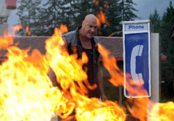 Much of the wheel-spinning chit chat is between fire investigator Ava (V‘s Lexa Doig, rising far above the material) and a smitten, chain-smoking (har!) Federal agent Lee Cooper, played by Lost‘s Ian Somerhalder. Ava is just one crime scene behind Draven throughout the movie, scratching her head trying to figure out how the murderous conflagrations began. She’s sort of a one-woman CSI, and Doig recites the facts about fire with amusing aplomb.