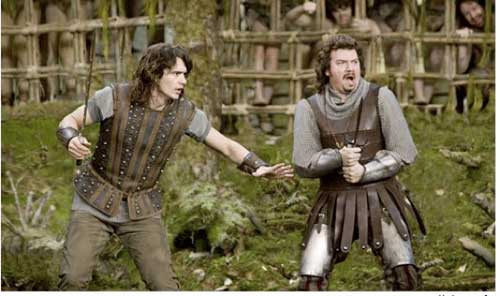 Set in a mythical medieval past populated by topless jungle women, multi-headed serpents, horny Yoda-like sages and earnest warrior Natalie Portman (Black Swan), Your Highness revolves around two royal brothers: fat, lazy stoner Prince Thadeous (Danny McBride, Due Date) and his dashing, stalwart brother Prince Fabious (James Franco, 127 Hours), who’s heir to the throne. But the two have no time for bongs and grog and are forced to spring into action after Fabious’ new bride Bella Donna (500 Days of Summer’s Zooey Deschanel, sporting one helluva push-up bodice) is abducted from the castle by the nasty sorcerer Leezar (Justin Theroux, Mulholland Dr.), who aims to get her pregnant and then spawn a dragon. Hmmmm…