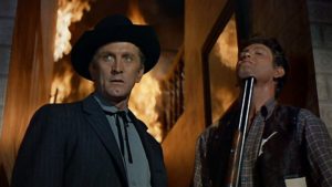 The film follows U.S. Marshal Matt Morgan (Douglas) on the trail of his wife’s killer. Adding a dark twist to the tale, the suspect’s father is Morgan’s longtime friend, cattle baron Craig Beldon (Quinn). Morgan is determined to capture the killer and take him away by the 9:00 train, against all odds.
